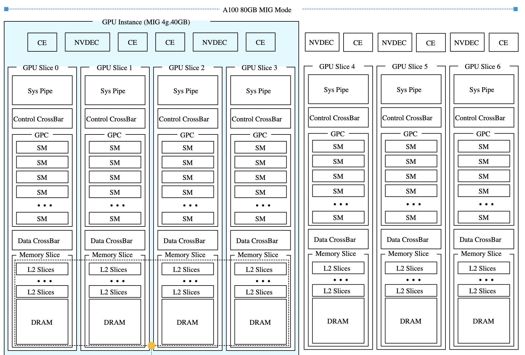 MIG использует другой подход к совместному использованию GPU. Вместо мультиплексирования вычислительных ресурсов между рабочими нагрузками MIG разделяет GPU на аппаратные экземпляры. Каждый экземпляр получает собственные выделенные вычислительные срезы (slices) и срезы памяти.