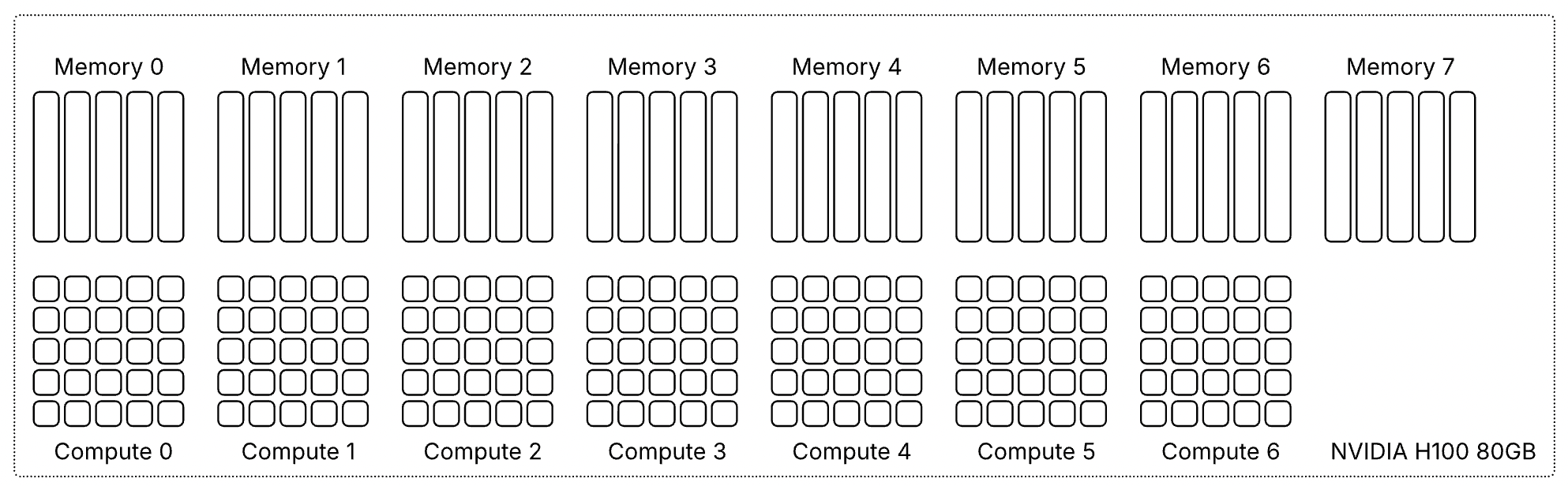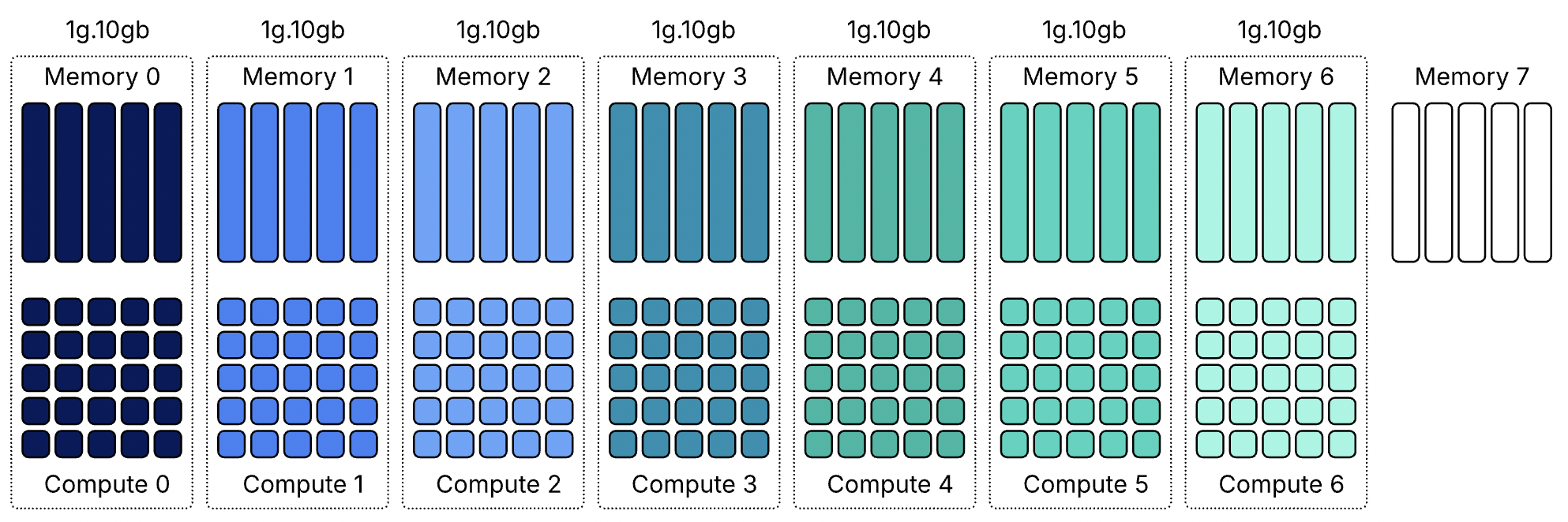 GPU всё ещё имеет восемь срезов памяти. После размещения семи экземпляров 10 гигабайт памяти остаются неиспользованными, или, иначе говоря, это потерянная ёмкость. Вычислительных срезов больше не осталось, поэтому ни один другой экземпляр не может быть запущен. Такое поведение легко не заметить в диаграммах размещения MIG. Эти диаграммы показывают области размещения памяти, и семь экземпляров 1g.10gb выглядят так, будто полностью заполняют GPU. На самом деле ограничивающим фактором являются вычислительные срезы, а не память.
