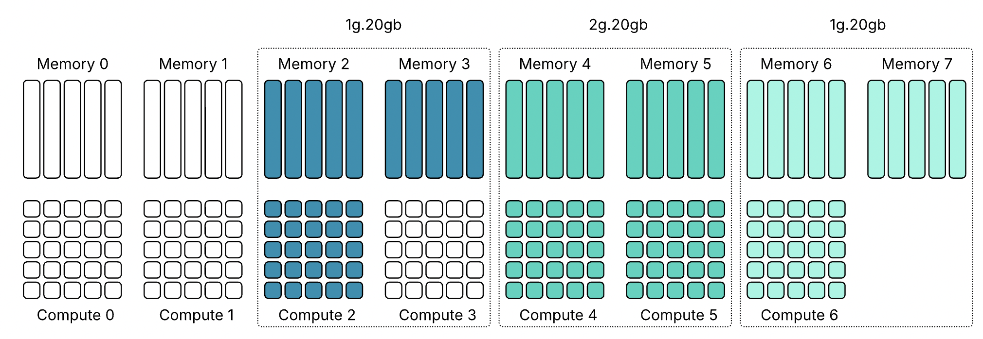 Эти профили показывают, что использование ресурсов MIG в большинстве случаев асимметрично. Некоторые профили предлагают одинаковый объём памяти, но отличаются вычислительной мощностью. Например, и 1g.20gb, и 2g.20gb предоставляют 20 GB памяти, но требуют разного количества вычислительных срезов.