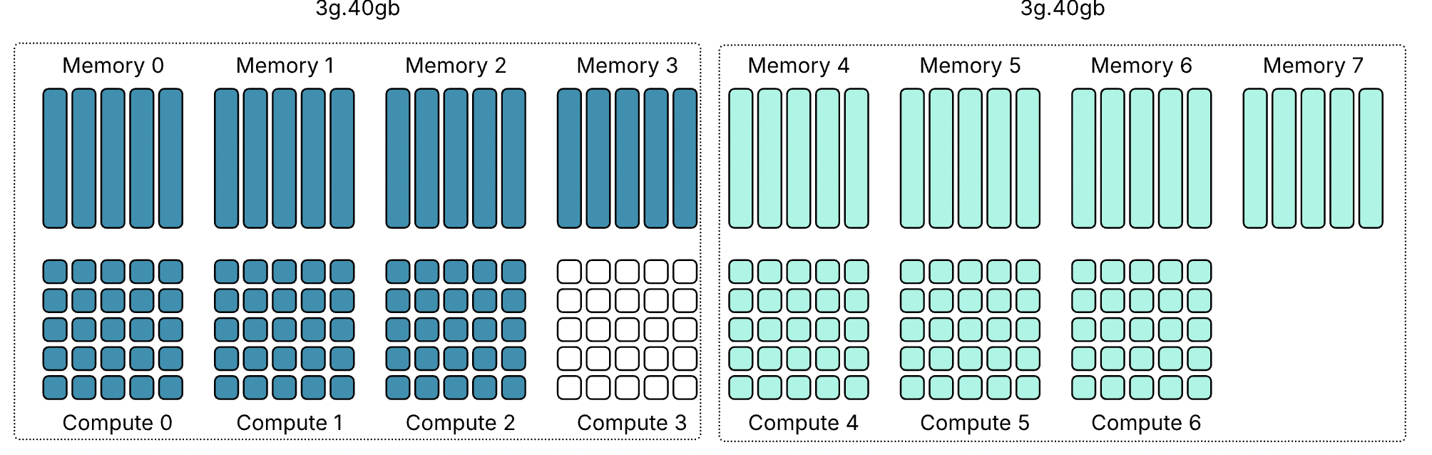 Экземпляр 3g.40gb с размещением 4:4 начинается с среза памяти 4 и занимает четыре среза, размещаясь во второй области. Экземпляр 4g.40gb с размещением 0:4 занимает первую область — единственную область, где может быть удовлетворено его требование к вычислительным ресурсам. Однако по мере размещения на GPU двух профилей 3g.40gb один вычислительный экземпляр оказывается потерянным.