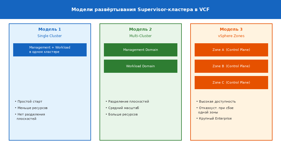 Центральным компонентом VKS является Supervisor-кластер — уровень управления Kubernetes, развёртываемый поверх рабочего домена VCF. Существует три основные топологии его размещения, и выбор между ними определяет поведение платформы при сбоях, требования к ресурсам и сложность эксплуатации.