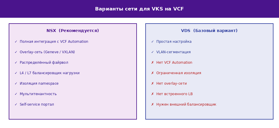 При настройке сети для VKS на VCF доступны два варианта: NSX и vSphere Distributed Switch (VDS). Выбор между ними оказывает существенное влияние на функциональность платформы и возможности автоматизации.