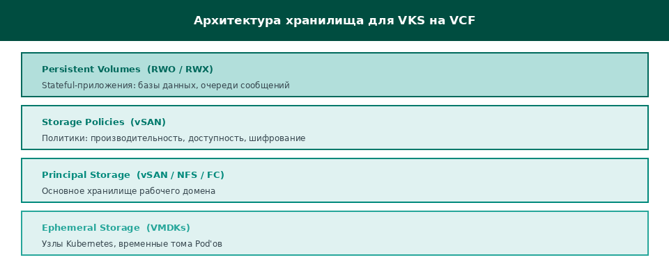 Постоянные тома (Persistent Volumes, PV) предназначены для stateful-приложений — баз данных, очередей сообщений, систем хранения состояния. Доступ к постоянному хранилищу управляется через Storage Policies — политики хранения vSAN, которые администратор создаёт в vCenter. Политики описывают параметры производительности, доступности (RAID-1, RAID-5/6) и шифрования. Каждый арендатор (tenant) в мультитенантной конфигурации получает доступ только к тем политикам хранения, которые ему явно назначены.