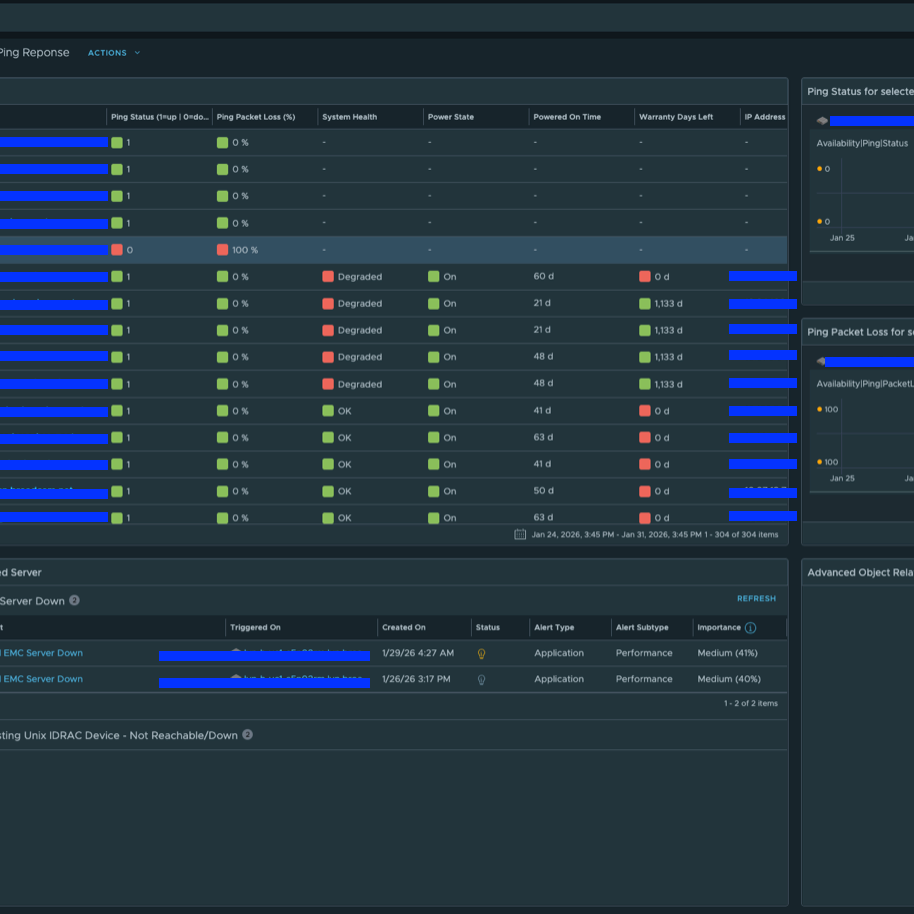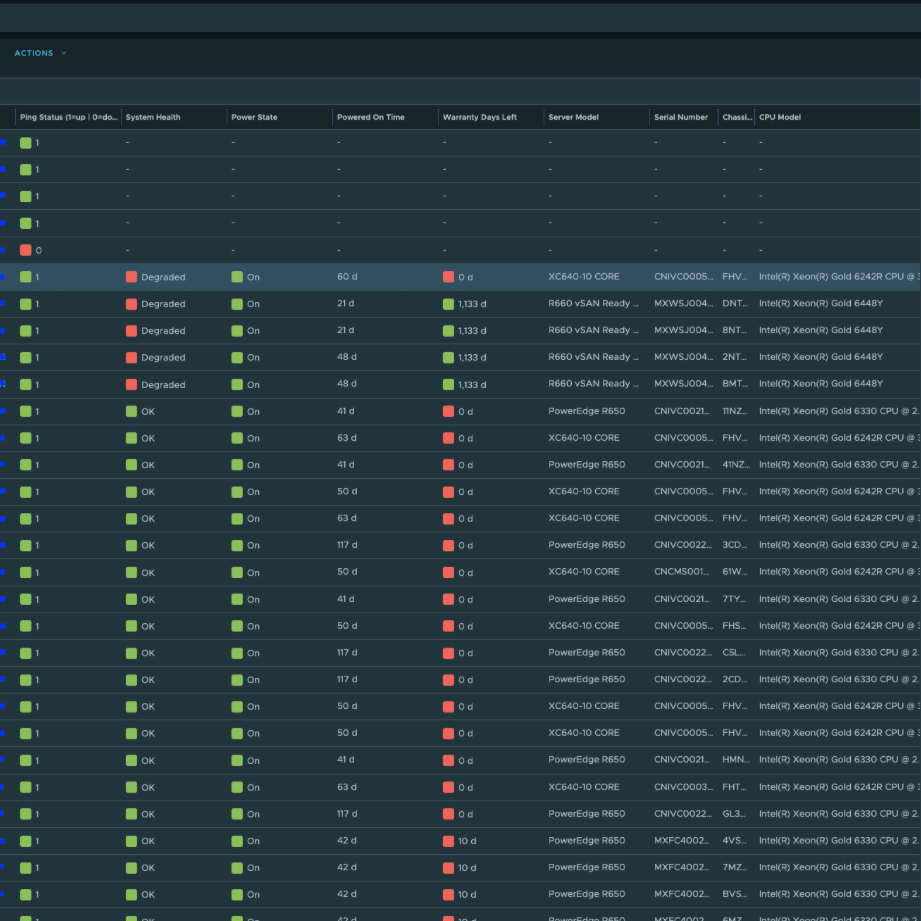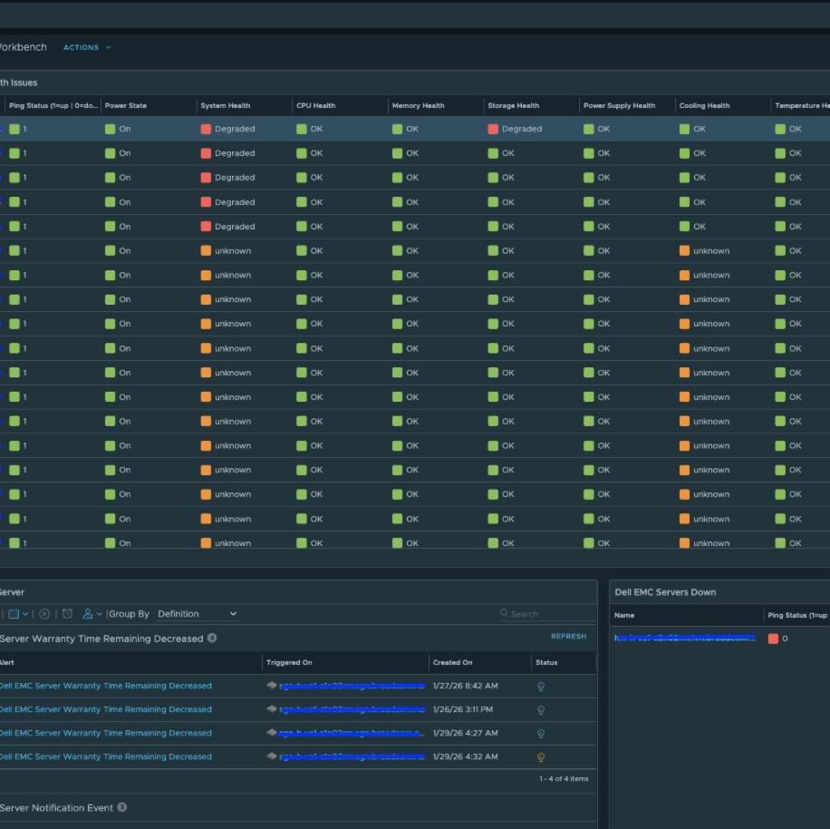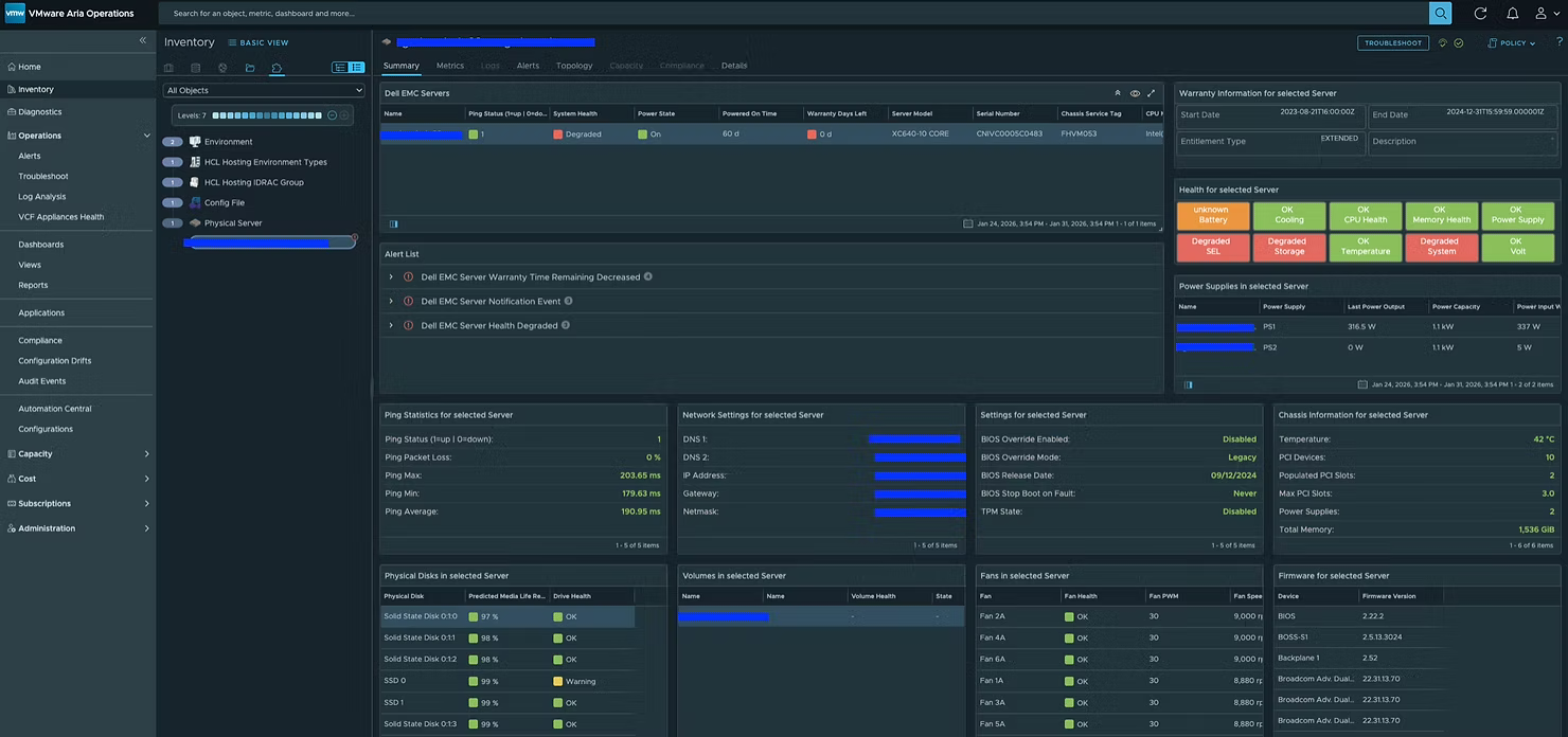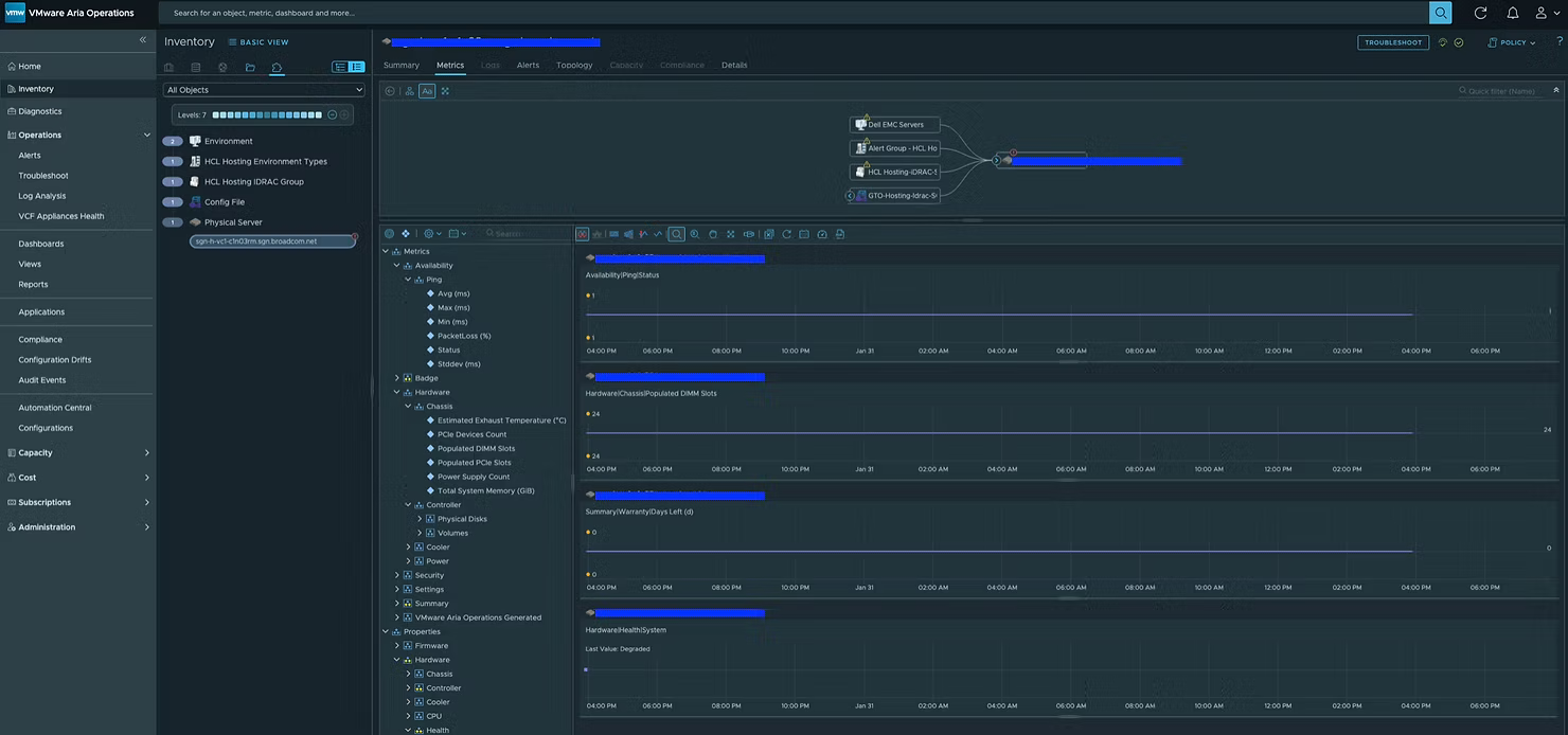 Ну а на днях стал доступен для скачивания проект Hardware vCommunity Management Pack для VCF Operations, разрабатываемый инженером Broadcom Онуром Ювсевеном. Начальная версия поддерживает серверы Dell EMC PowerEdge (с использованием Redfish API на iDRAC). Он собирает десятки метрик, свойств и событий. Пакет управления включает 5 дашбордов, 8 представлений, 14 алертов и 19 симптомов (symptoms). Дашборды выглядят следующим образом.