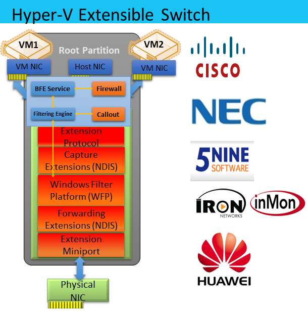 Hyper-V Extensible Switch является открытой платформой, позволяющей разрабатывать расширения стандартного интерфейса Windows (API). Это позволило разработчикам-партнерам: Cisco, Huawei, NEC, InMon, 5nine, Iron Networks добавить такие функции как мониторинг, переадресация и фильтрация в виртуальном коммутаторе. Расширения реализуются путем использования спецификации фильтра драйверов интерфейса интернет-устройств (NDIS) и драйверов вызова Windows Filtering Platform (WFP).