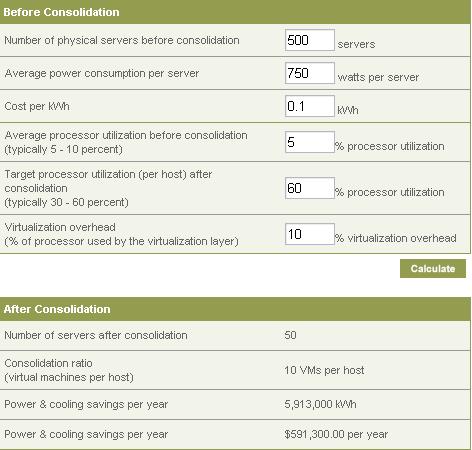 Как видно из результатов, для большого числа серверов с малым коэффициентом загрузки, экономия доходит до полумиллиона долларов в год только на электроэнергии! Безусловно, это чересчур оптимистичные прогнозы, однако стоит учитывать и этот фактор при расчете экономии на виртуальной инфраструктуре.