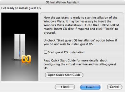 13. Если вы устанавливаете Windows Vista с DVD, то вставьте его сейчас, оставьте галку «Start guest OS installation», нажмите Finish и смотрите шаг 17. Если вы собираетесь устанавливать Vista с ISO-образа, не устанавливайте галку «Start guest OS installation» и смотрите следующий шаг.