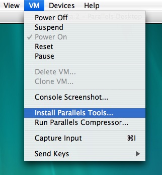24. В меню виртуальной машины выберите пункт VM, а в нем Install Parallels Tools: