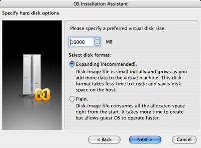 7. Теперь необходимо установить размер виртуального жесткого диска для Windows Vista, программа рекомендует 16000 Мб (чуть меньше 16 Гб), однако, если вы не собираетесь постоянно использовать Vista, можно сделать и поменьше. Тем не менее, если вы выберите тип диска «Expanding», который рекомендуется, то свободное место не понадобится вам сразу – файл виртуального диска будет расти с его заполнением внутри гостевой системы. Если вы выберете тип диска «Plain», то файл определенного вами объема создастся сразу (при этом потребуется некоторое время), однако такой диск будет работать быстрее, чем «Expanding». В любом случае, вы сможете потом преобразовать один тип диска в другой, используя Parallels Image Tool. После выбора параметров диска нажимаем Next: