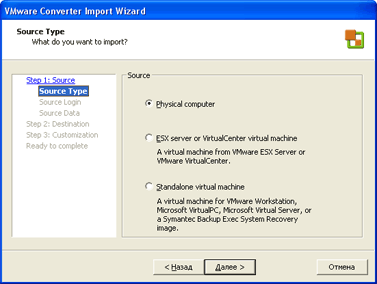 С VMware converter это так же просто, хотя и несколько дольше. Этот продукт позволяет снять для последующей виртуализации точную копию реальной машины. Впрочем, конвертер в качестве источника может использовать также: