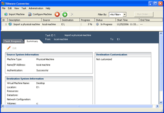 Установив и запустив VMware converter (beta 3.0 Starter Edition), вы увидите окно с пустым пока списком задач. Философия задач скорее зарезервирована для более мощной версии Enterprize, если вы вдруг захотите виртуализировать все 157 машин вашей локальной сети, но в любом случае создать задачу придется.