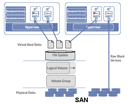 Виртуальные сервера Virtual Iron могут иметь до 16 виртуальных дисков, которые могут составлять комбинацию из логических и Raw-дисков. Raw-диски подключаются напрямую к системам хранения данных в SAN LUNs (Logical Unit Number – логические устройства дискового массива) по каналу Fibre Channel или iSCSI, используя обычный сетевой адаптер. Raw-диски обладают большим, чем логические диски, быстродействием и могут применяться для виртуальных серверов, требующих высокой скорости дискового ввода-вывода, например, серверов баз данных. Структура виртуальных дисков Virtual Iron показана далее: