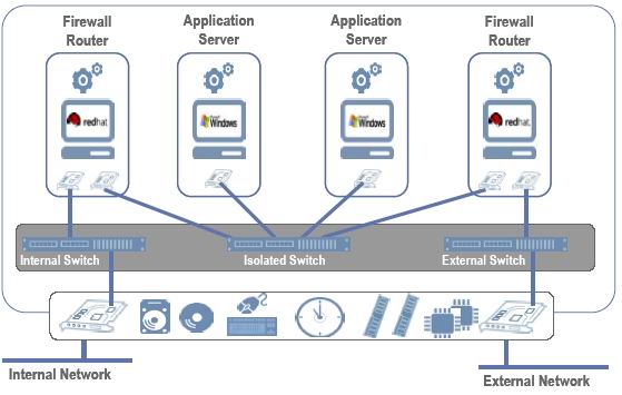 Виртуальные коммутаторы изолированы друг от друга и объединяют несколько виртуальных машин в виртуальную сеть. Один из виртуальных коммутаторов подключен напрямую во внешнюю сеть, а доступ к двум виртуальным серверам приложений как изнутри, так и снаружи, осуществляется через сетевые экраны. И все это инкапсулировано в пределах одного физического сервера. Таким образом, Virtual Iron открывает широкие возможности по моделированию виртуальной инфраструктуры и виртуальных сетей, с учетом реальной ИТ-инфраструктуры компании.