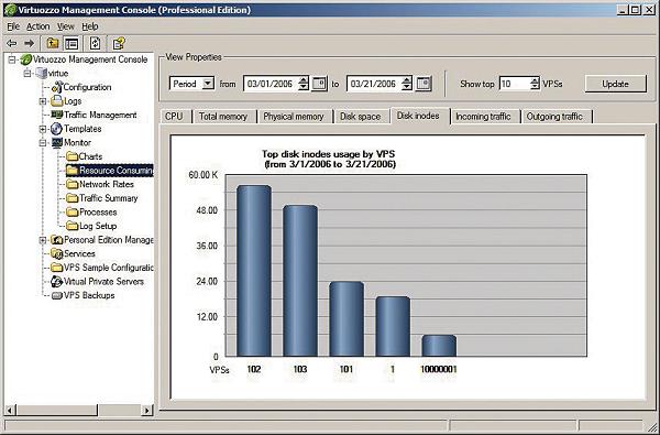 С помощью консоли управления тонкими клиентами Virtuozzo for Linux 3.0 удобно контролировать использование VPS