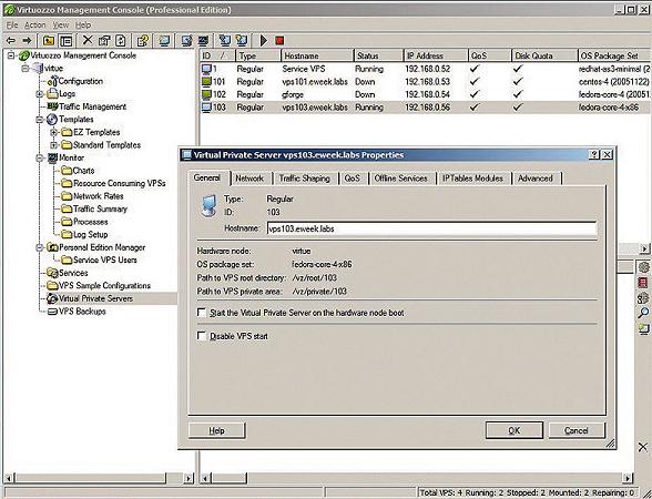 Помимо прямого подключения через протокол SSH (Secure Shell) к какому-либо экземпляру гостевой системы, уже знакомому нам по недавно тестировавшимся продуктам VMware и Microsoft Virtual Server, инструменты управления Virtuozzo позволяют запускать и отключать инсталлированные сервисы, а также задавать постоянные значения параметров Runlevel. Плюс к этому мы могли просматривать и модифицировать файловые системы на созданных нами VPS.