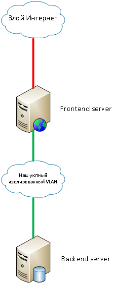 Вы пошли на поводу у «системы» и решили не выбиваться из общей массы тех, кто пользуется frontend/backend-топологией. Например, у вас есть web-сервер с каким-то важным контентом и база данных, к которой этот самый сервер обращается. База данных должна быть недоступна со стороны интернета, потому как он наводнен всякими маргиналами, пытающимися эту самую базу украсть/взломать/допишите сами. Самый простой вариант защиты – оградить ее (базу, сервер баз данных) от общения с беснующимся Интернетом на 2-м уровне сетевой модели OSI. И это тоже нам по силам. Мы выдаем 2 сети: богатую (целых 5 IP адресов) внешнюю сеть и безразмерную внутреннюю. Web-сервер мы подключаем к этим двум сетям разными адаптерами (да, такое тоже возможно!), сервер баз данных подключаем только ко внутренней сети. Получится примерно такая топология: