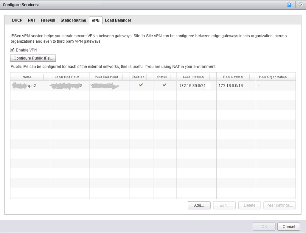 Подключение на 3 уровне осуществляется через общедоступную сеть Интернет при помощи туннелирования. Это самый простой способ. Реализуется он также на базе vShield, либо любого другого специализированного дистрибутива. vShiled предоставляет только IPSec-туннели. Ниже пример действующего туннеля одного из наших клиентов:
