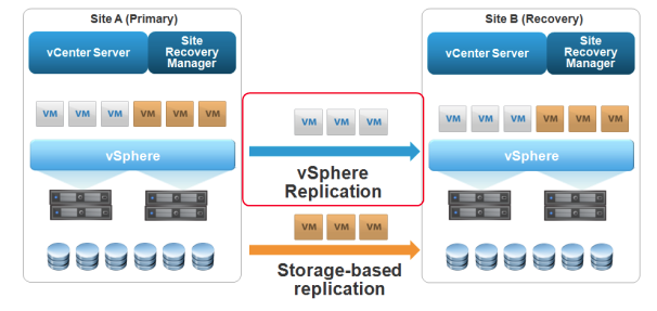 На рисунке изображен типичный сценарий аварийной площадки средствами SRM Active-Passive. Есть два сайта, каждый содержит свой набор серверов ESXi с общим хранилищем и персональным vCenter. На картинке VM разделены на две группы приоритетов: для первой репликация виртуальных дисков происходит средствами vSphere Replication, для второй этим занимаются системы хранения (Storage-based replication). Такое разделение полезно, когда VM много, а места на СХД с собственной репликацией мало. Благодаря своеобразной балансировке трафика между аппаратной репликой и vSphere Replication, можно использовать в защите менее важных виртуальных машин более дешевые системы хранения.