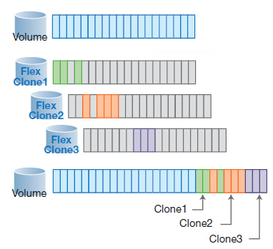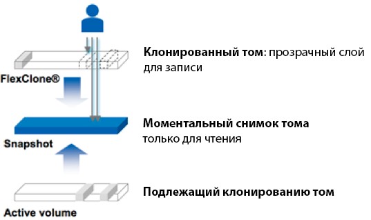 Идея FlexClone в том, чтобы мгновенно создавать копию тома без копирования реальных данных. Просто создается копия-пустышка со ссылкой на исходную информацию «живого» тома. Если же потребуется что-то дописать в клонированный раздел, то для этого используется специальная область.