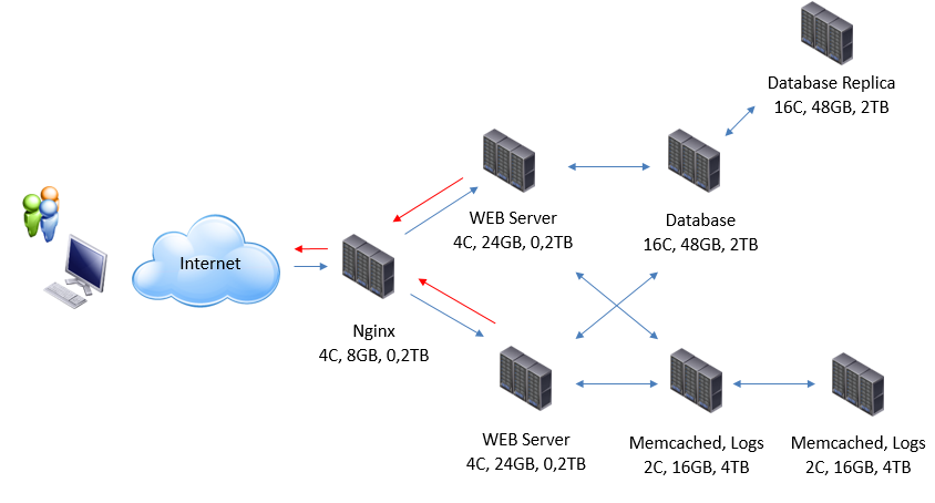 Что мы имеем согласно проекту? Техническая составляющая включает в себя сервер Nginx, веб-серверы, серверы баз данных и журналов. В приведенной ниже таблице отражено количественное представление ресурсов: