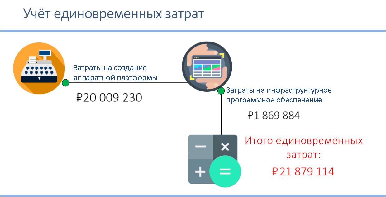 Таким образом, единовременные затраты рассчитываются из суммы затрат на создание аппаратной платформы и затрат на инфраструктурное программное обеспечение: