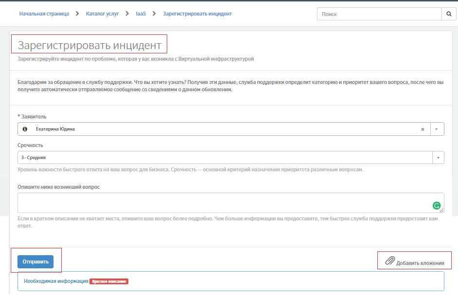 В случае если какое-либо ПО, сервис или техническое устройство не работает или работает ненадлежащим образом, клиент, используя портал, сообщает об этом службе технической поддержки. Для создания нового инцидента или запроса необходимо заполнить соответствующие поля и сформировать обращение.
