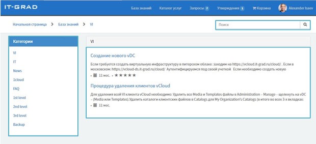 Как отмечалось выше, портал самообслуживания располагает обширной базой знаний, которую клиент использует для получения ответов на возникающие вопросы. Информация в базе представлена в виде тематических статей, описывающих бизнес-процессы, функции сервисов, программных продуктов или иных решений.