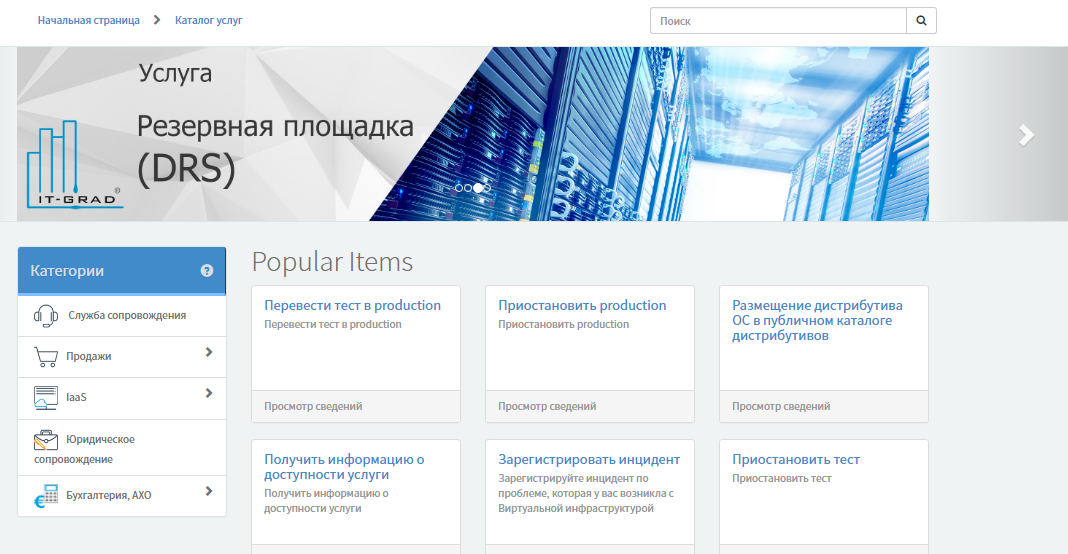 Важная задача, которую решает портал, связана с созданием запросов на получение сервисных услуг, предлагаемых поставщиком. Для удобства навигации по порталу все услуги разделяются на категории, причем в центральной части страницы отображаются наиболее популярные сервисы.