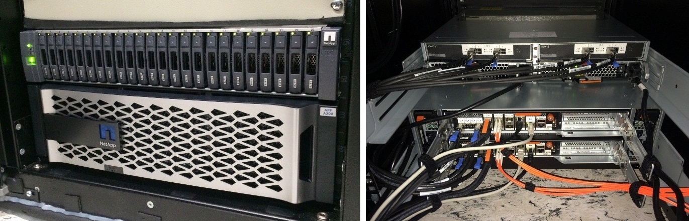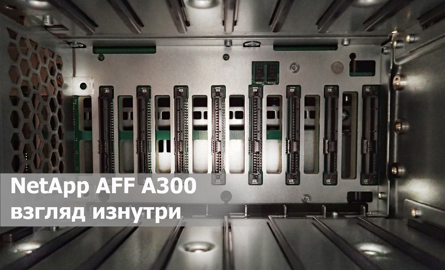 Два новых 16-ядерных процессора Intel Broadwell-DE c частотой 1.70 ГГц представляют собой «мозг» системы и поддерживают технологию Hyper-Threading, виртуализацию VT-x/VT-d и Turbo Boost. Что касается RAM, в каждый контроллер установлено 4 модуля оперативной памяти RDIMM ECC объемом в 32 ГБ, что суммарно образует 128 Гб, из которых 120 Гб отводится под кэш, а оставшиеся 8 ГБ – под NVRAM. В наследство от FAS8200 новому решению досталась та же самая аппаратная платформа, которая в A300 отличается отсутствием FlashCache NMVe-модулей. Это объясняется тем, что all-flash- системы в ней не нуждаются. Как следствие, материнская плата имеет два пустых слота M.2 PCIe.