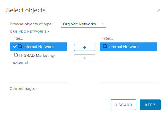 Кликнув по значку «+» в ячейке Source или Destination, можно добавить новый объект – сеть организации vDC, виртуальную машину, указать IP-диапазон, а также использовать фильтры.