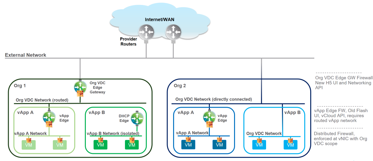 Отметим, что в vCloud Director 8.20 можно работать с пограничным шлюзом (Edge gateway) и распределенным (Distributed) файерволом. Чтобы уловить разницу между ними, рассмотрим отдельные примеры.