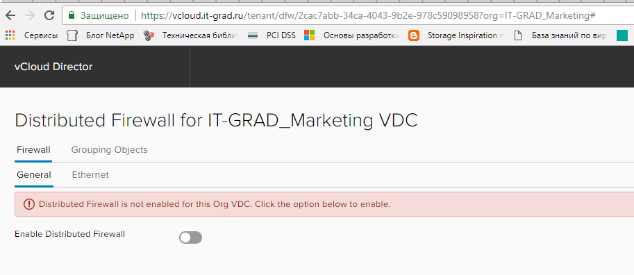 Прежде чем использовать портал vCloud Director для работы с распределенным файерволом, необходимо активировать (включить) распределенный брандмауэр на уровне организации виртуального ЦОД.