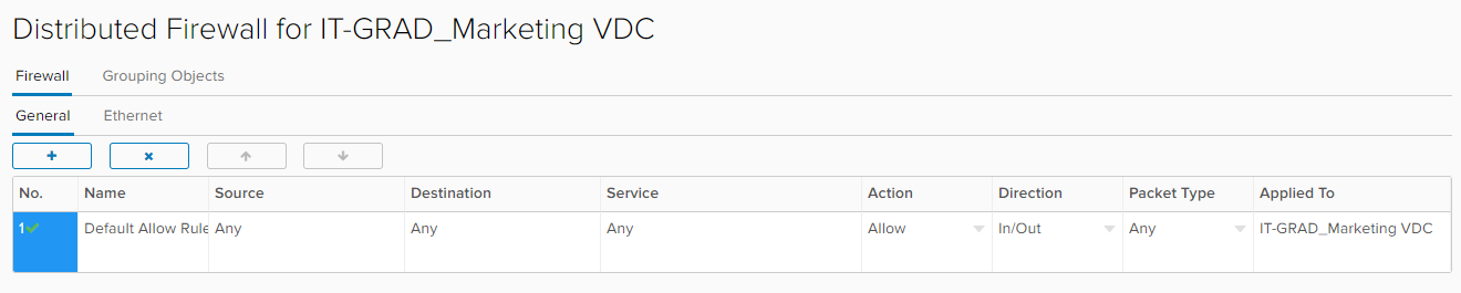 Если кликнуть по ссылке Manage Firewall в свойствах виртуального ЦОД, откроется окно управления DFW, которое выглядит так: