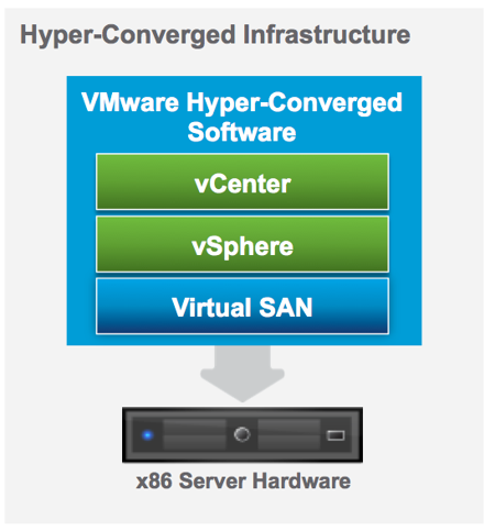 Одним из лидеров в области предоставления программного обеспечения для создания гиперконвергентных программноопределяемых ЦОД являет компания VMware, а vSAN дополнил корзину продуктов компании в части software-defined storage. vSAN полностью интегрирован в гипервизор VSphere, не требует сторонних средств для развертывания и позволяет превратить стоечные серверы различной модификации в единый центр обработки данных без необходимости использования отдельных СХД или построения сети передачи данных.