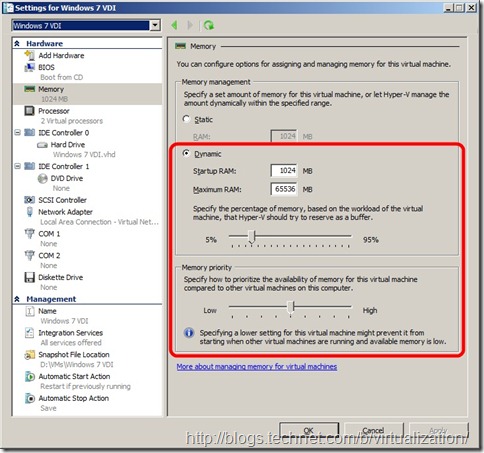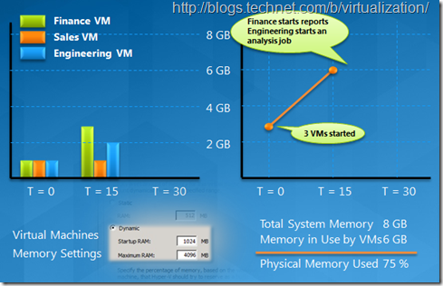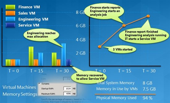 В первую очередь, Dynamic Memory позволяет выделять виртуальной машине на хосте Hyper-V память динамически, в соответствии с запросами ВМ. То есть, это позволяет не выделять всю возможную для использования ВМ память, а выделить столько, сколько нужно для базовой загрузки и простейшей работы. Во-вторых, посредством Dynamic Memory Balancing происходит перераспределение памяти между работающими виртуальными машинами, что приводит к росту коэффициента консолидации виртуальных машин на хост-сервере Hyper-V R2 до 40% (особенно для VDI-нагрузок).