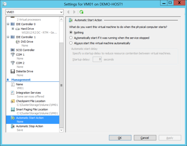 Итак, если вы откроете настройки виртуальной машины в Hyper-V, то увидите такой пункт как Automatic Start Action, где собственно и задаются настройки поведения ВМ при старте хоста: