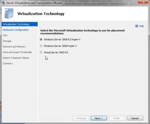 4. Запускаем Server Consolidation Wizard, где указываем профиль оборудования, свойства хранилищ виртуальных машин, параметры консолидации (например, столько-то виртуальных машин на хост Hyper-V):
