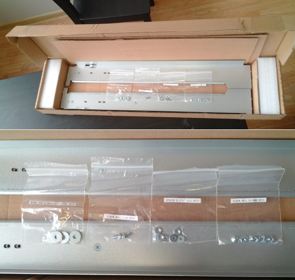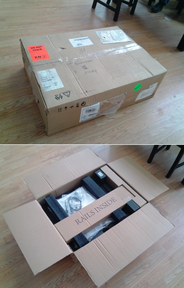 Коробочка довольно-таки небольших размеров, весом в 26 кг, не смотрите что на коробке 110 кг – это запугивание. Коробку вскрываем. В отличие от дисков, которые NetApp присылает в гигантских коробках с кучей поролона, тут все выглядит скромно. Сэкономили место даже с рельсами, компактно упаковав их в пазлах упаковки. Довольно практично.