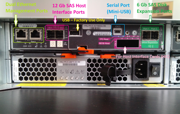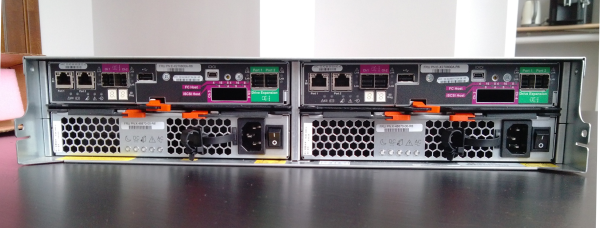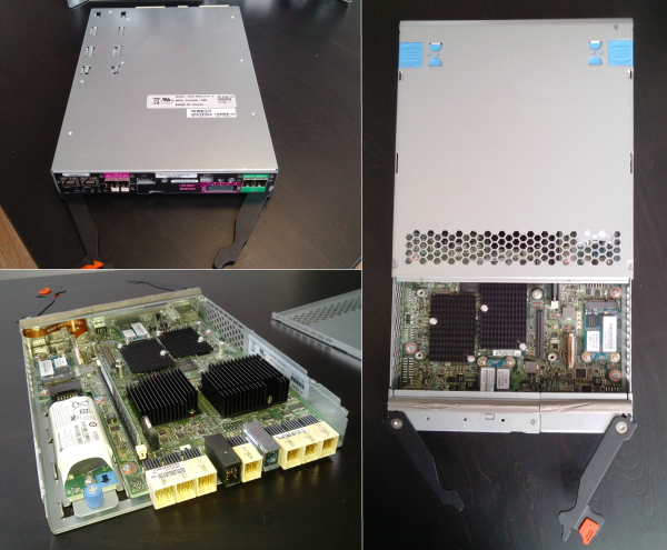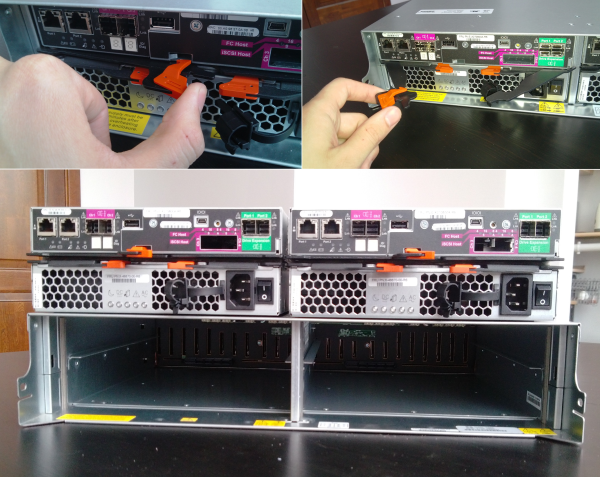 Четыре FRU (Field Replaceable Unit) – легкосменные модули, поддерживающие «горячую» замену в случае сбоя, группируются попарно: 2 контроллера хранилища и 2 блока питания. Контроллеры сверху.