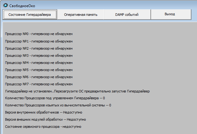 После загрузки OS Windows нужно запустить гиперагент (файл Free_Eye.exe), которая организует интерфейс между гипердрайвером и пользователем системы. Эта программа выполняется на прикладном уровне и может работать в любой современной ОС Windows.
