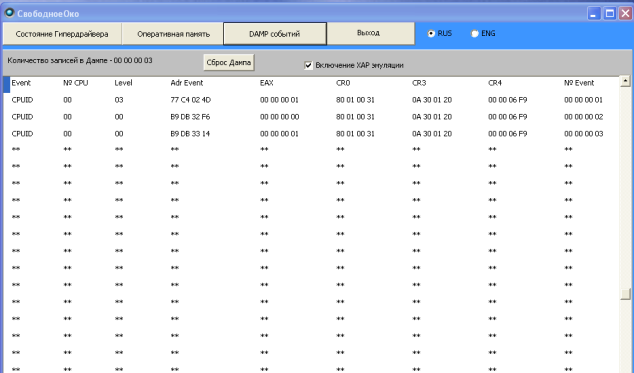 После запуска агента можно редактировать «хар» область подстановок непосредственно в его редакторе, запускать с разными значениями подстановок исследуемые программы и регистрировать в дампе события выполнения команды CPUID.