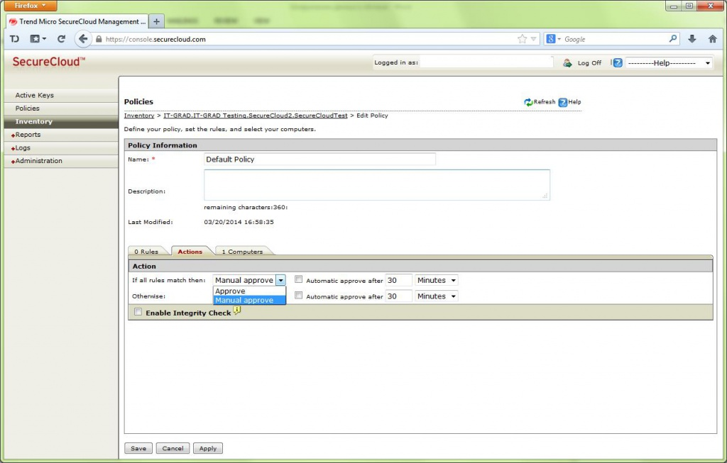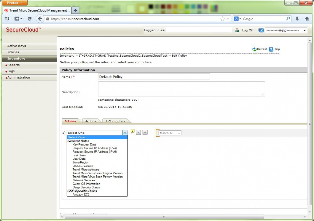 После окончания процесса данные на дисках оказываются полностью зашифрованными, с ключом, сохраненном только в системе SecureCloud и оперативной памяти ОС виртуальной машины. Для управления процессом доступа к ключам используются политики, которые позволяют определить условия, при которых происходит автоматическая или ручная выдача, или отзыв ключа шифрования. В качестве условий кроме общих, таких как например ip адреса клиента, могут использоваться параметры антивируса TrendMicro: