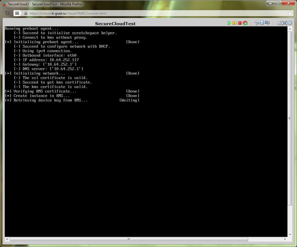 При загрузке зашифрованной машины, перед ОС происходит загрузка агента, который, устанавливая безопасное соединение с системой SecureCloud, производит запрос ключа для доступа к данным: