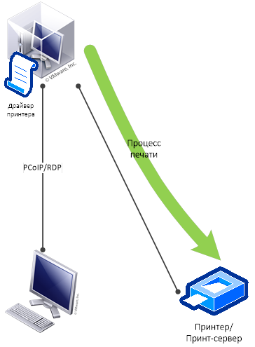 При такой архитектуре печать осуществляется с использованием канала, созданного между физическим устройством и виртуальным десктопом. Также при этом используются драйвера печати уже установленные на физическое устройство (см. Рисунок 1).