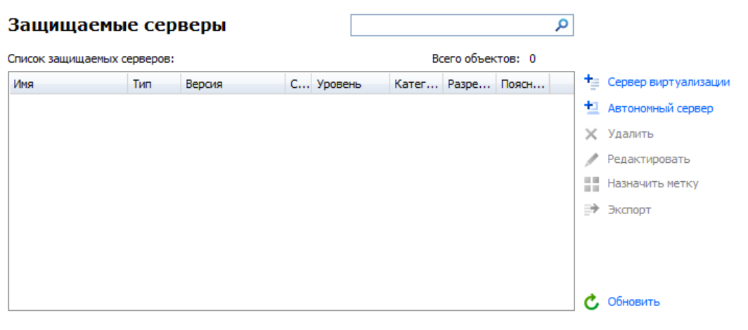 1. В консоли управления выберите функцию "Защищаемые серверы". В верхней части области параметров появится список защищаемых серверов.