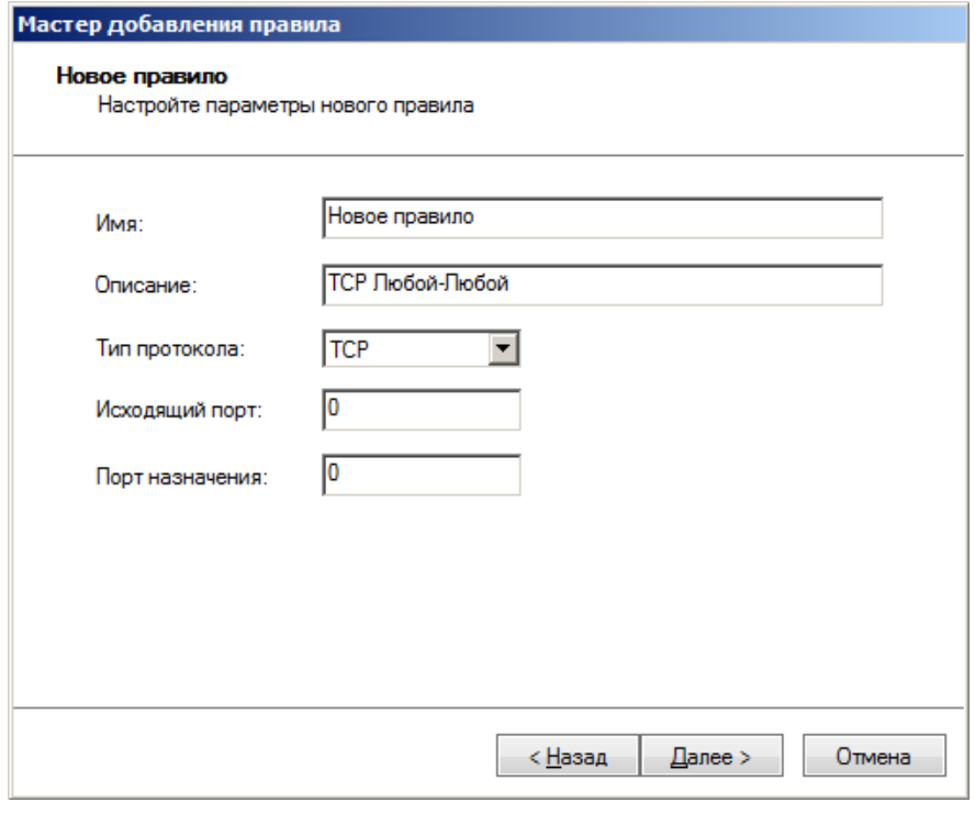 Исходящий порт - исходящий порт. Символ "0" (ноль) означает, что правило действует для всех портов.