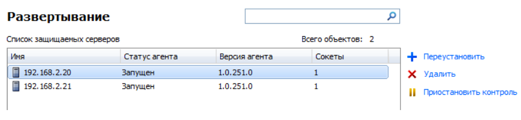 4. Для приостановки контроля защиты Hyper-V в консоли управления выберите функцию "Развертывание". В области параметров появится список серверов Hyper-V: