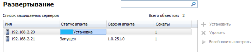 Добавленный сервер Hyper-V появится в списке защищаемых серверов. При успешном завершении установки агента защиты Hyper- V в разделе "Развертывание" консоли управления появится номер версии агента и сооб-