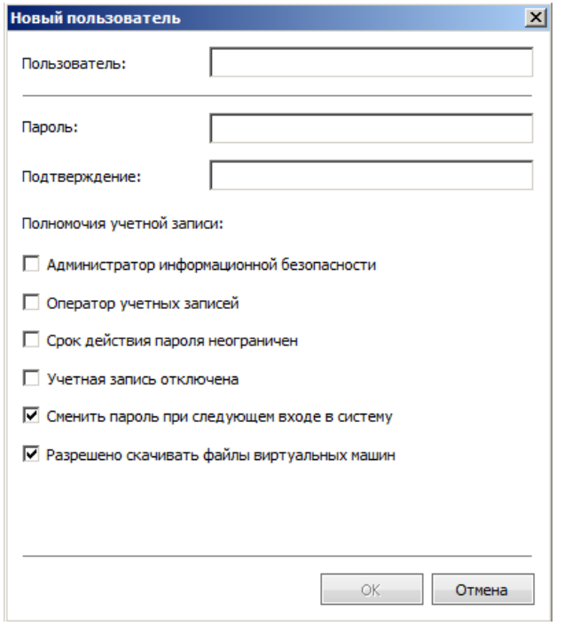 Укажите имя пользователя, дважды введите пароль, задайте другие параметры (при необходимости) и нажмите кнопку "ОК".