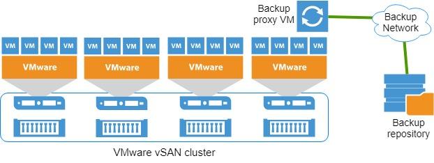 В нашем случае бэкап-прокси ВМ должна находиться на одном из хостов ESXi кластера vSAN, который мы бэкапим. Извлечение данных происходит по сети vSAN. Таким образом, для работы в режиме Virtual appliance в каждом кластере vSAN должно быть развернуто минимум по одному бэкап-прокси. Развернуть пару бэкап-прокси (например, в менеджмент-кластере) и бэкапить ими все кластеры vSAN не получится.